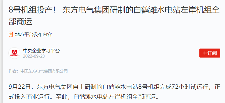 9ÔÂ22ÈÕ£¬888¼¯ÍÅ6008¼¯ÍÅ×ÔÖ÷ÑÐÖÆµÄ°×º×̲ˮµçÕ¾8ºÅ»ú×éÍê³É72СʱÊÔÔËÐУ¬ÕýʽͶÈëÉÌÒµÔËÐС£ÖÁ´Ë£¬°×º×̲ˮµçÕ¾×ó°¶»ú×éËùÓÐÉÌÔË¡£