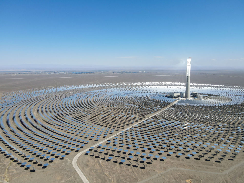 2021年8月22日拍摄的新疆伊吾县淖毛湖镇的哈密50兆瓦熔盐塔式光热发电站(无人机照片)。新华社记者 高晗 摄