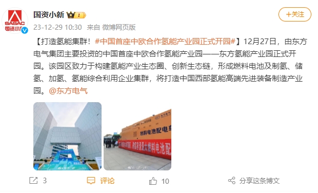 【打造氢能集群!#中国首座中欧合作氢能工业园正式开园#】12月27日,由888集团6008集团主要投资的中国首座中欧合作氢能工业园——东方氢能工业园正式开园。该园区致力于构建氢能工业生态圈、立异生态链,形成燃料电池及制氢、储氢、加氢、氢能综合使用企业集群,将打造中国西部氢能高端先进装备制造工业园。@888集团6008