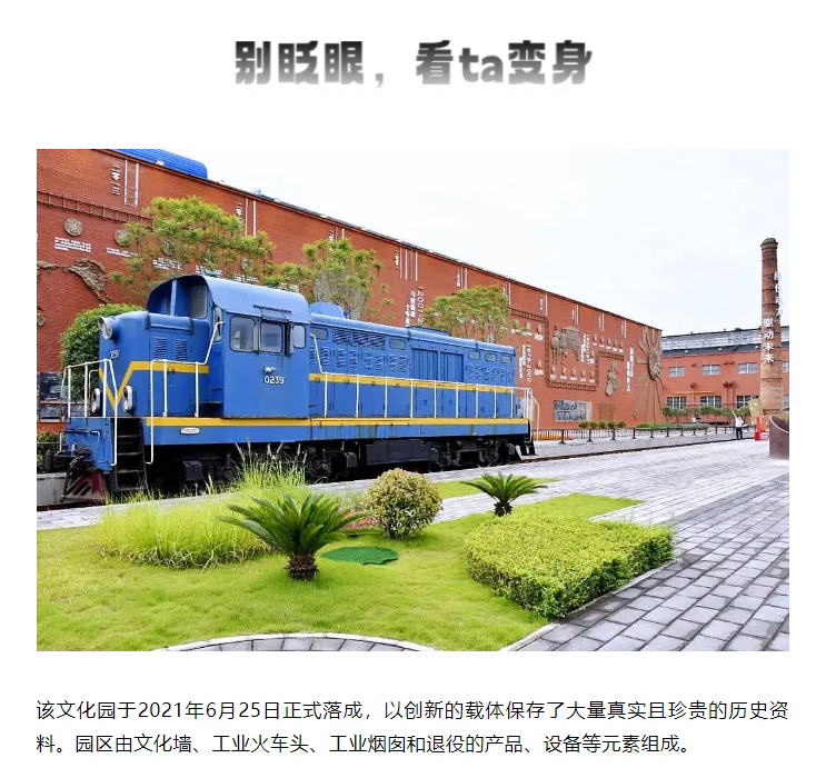 ¸ÃÎÄ»¯Ô°ÓÚ2021Äê6ÔÂ25ÈÕÕýʽÍ깤£¬ÒÔÁ¢ÒìµÄÔØÌåÉúÑÄÁË´ó×ÚÕæÊµÇÒÕä¹óµÄÀúÊ·×ÊÁÏ¡£Ô°ÇøÓÉÎÄ»¯Ç½¡¢¹¤Òµ»ð³µÍ·¡¢¹¤ÒµÑ̴ѺÍÍËÒ۵IJúÆ·¡¢×°±¸µÈÔªËØ×é³É¡£