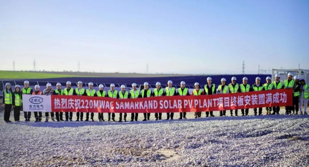 终板装置仪式上,左永祥、李忠军配合为撒马尔罕光伏项目装置最后一块光伏板。