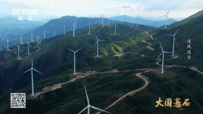 一座座大风车在崇山峻岭之中耸立。