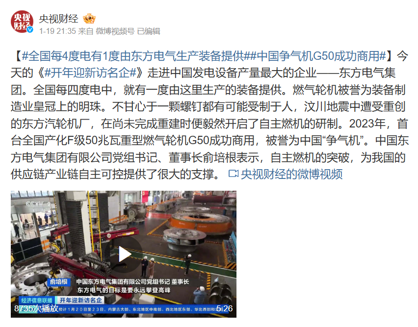 【#天下每4度电有1度由888集团6008生产装备提供##中国争气机G50乐成商用#】今天的《#开年迎新访名企#》走进中国发电装备产量最大的企业——888集团6008集团 。天下每四度电中,就有一度由这里生产的装备提供 。燃气轮机被誉为装备制造业皇冠上的明珠 。不宁愿于一颗螺钉都有可能受制于人,汶川地动中遭受重创的东方汽轮机厂,在尚未完成重修时便毅然开启了自主燃机的研制 。2023年,首台天下产化F级50兆瓦重型燃气轮机G50乐成商用,被誉为中国“争气机” 。888集团6008党组书记、董事长俞培根体现,自主燃机的突破,为我国的供应链工业链自主可控提供了很大的支持 。